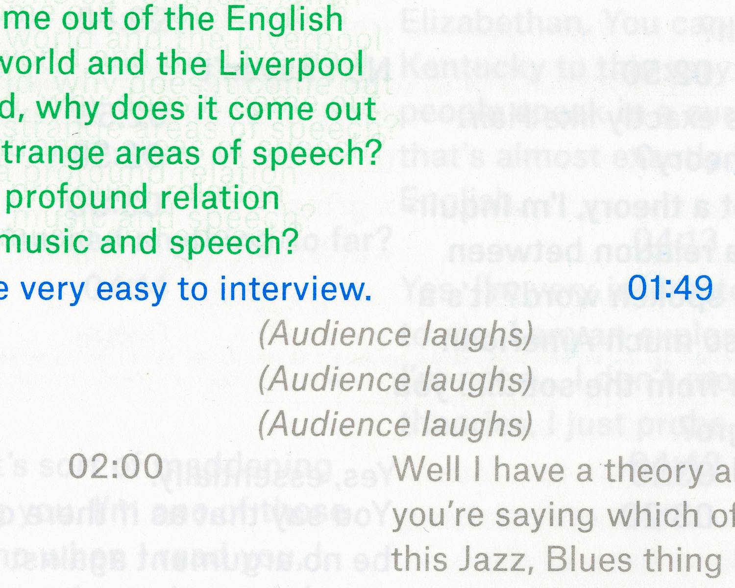(06) Back & Forth, a book of interviews, page detail, 152 p. 8 × 10 in. perfect bound softcover, 1/0 risograph, 3/3 risograph