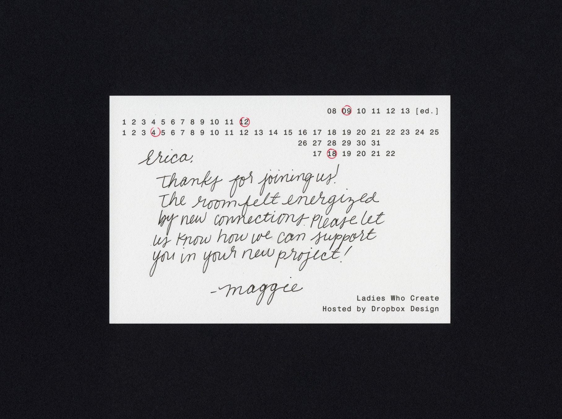 (15) LWC, thank you card, 4 × 6 in., 1/0 offset, 0.125 ⌀ metallic stamp, handwriting (thanks Michelle Morrison)