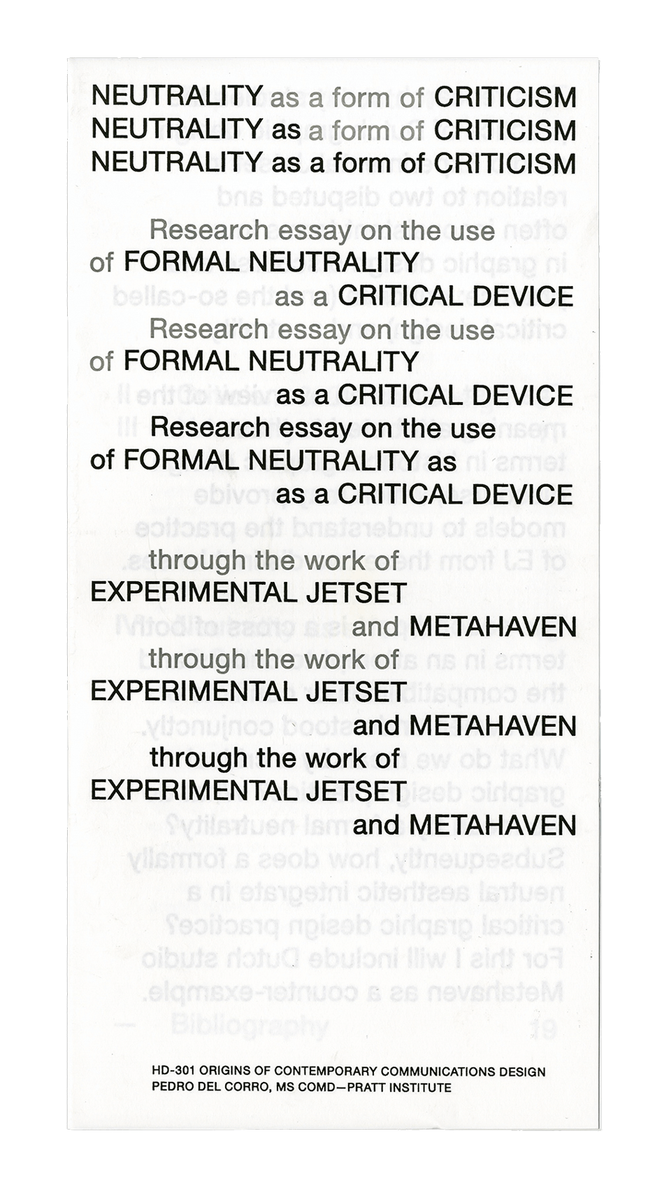 (27) Neutrality as a form of criticism, research essay, 4 × 8 in. saddle stitch booklet, 2/2 risograph